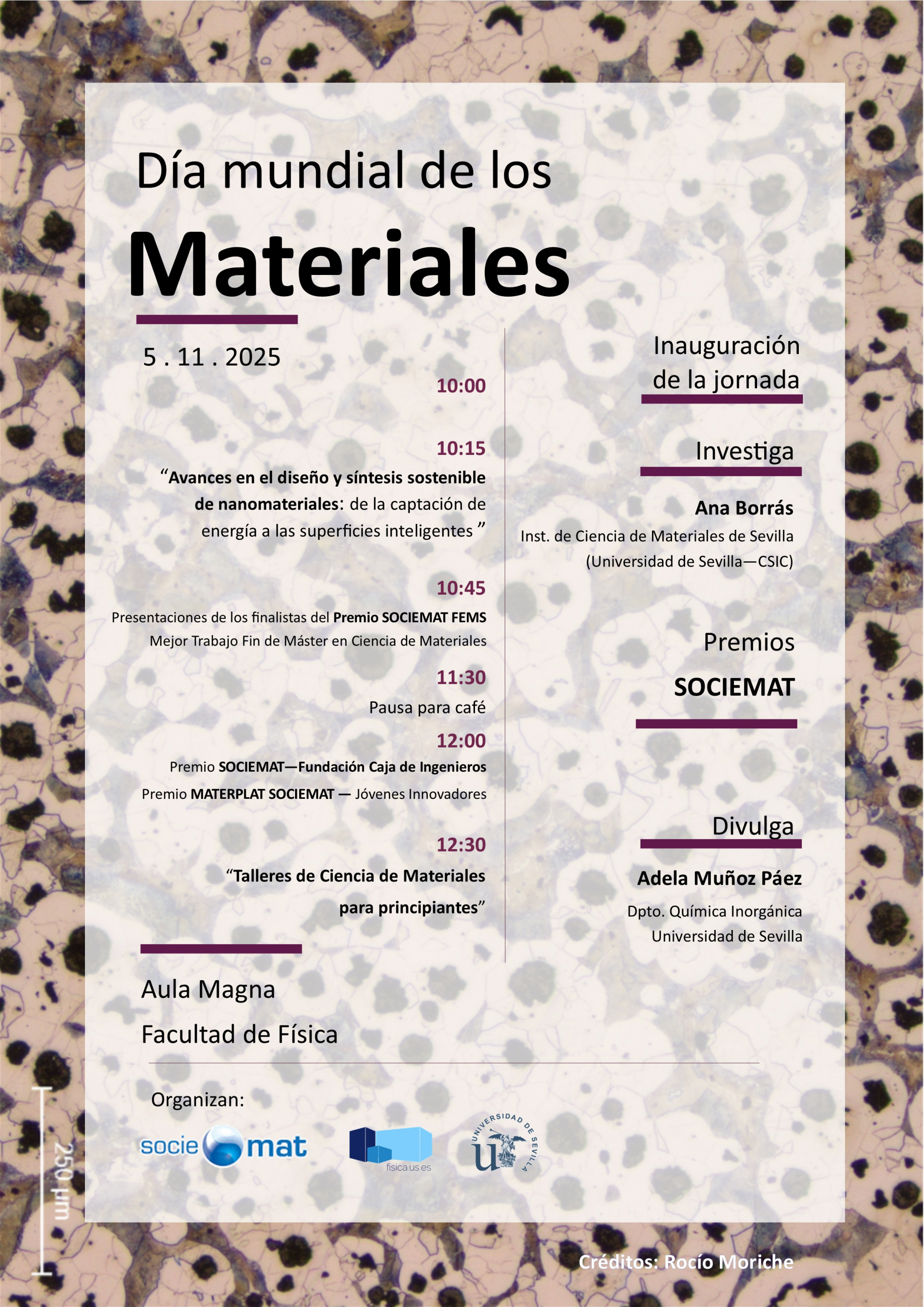 La Facultad de Física de la Universidad de Sevilla se une a los actos para conmemorar el día mundial de los Materiales. Este día se celebra por parte de las sociedades miembros de la Federación Europea de Sociedades de Materiales, FEMS, el primer miércoles del mes de noviembre, con el objetivo de poner de manifiesto la importancia de los Materiales en nuestra vida diaria.